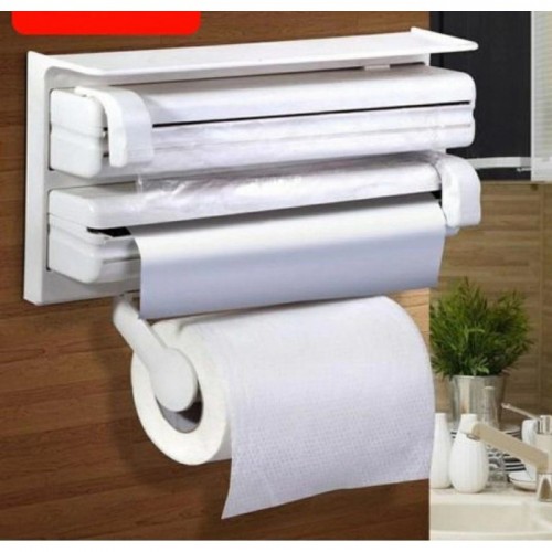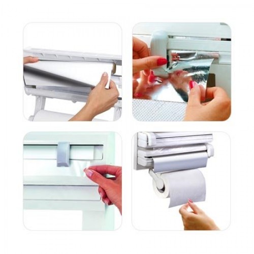 U njega se uvlače plastične folije, papirni ubrusi i aluminijske folije te ih odmah čine dostupnim, bez potrebe za traganjem po kući. Ima kompaktno plastično kućište i može se postaviti na zid vijcima. Zbog vaše sigurnosti dozator s trostrukim valjkom radi bez upotrebe opasnih noževa – jednostavno pritisnite i jedinstvena žljebasta linija za rezanje odvojit će dužinu aluminijske folije ili prozirne folije. Jednostavno postavljanje, sastoji se od 2 podesiva pretinca, također odvojivog držača za kuhinjske role. Gornji dio može se koristiti kao polica za držanje malih posuda za začin.